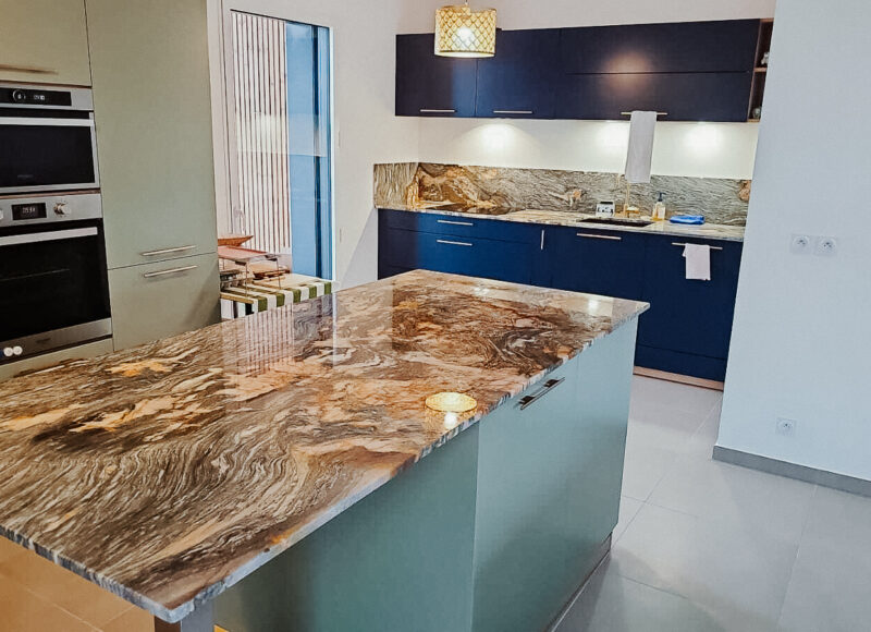 Création d’un îlot central et d’un plan de travail en quartzite Elegant Brown