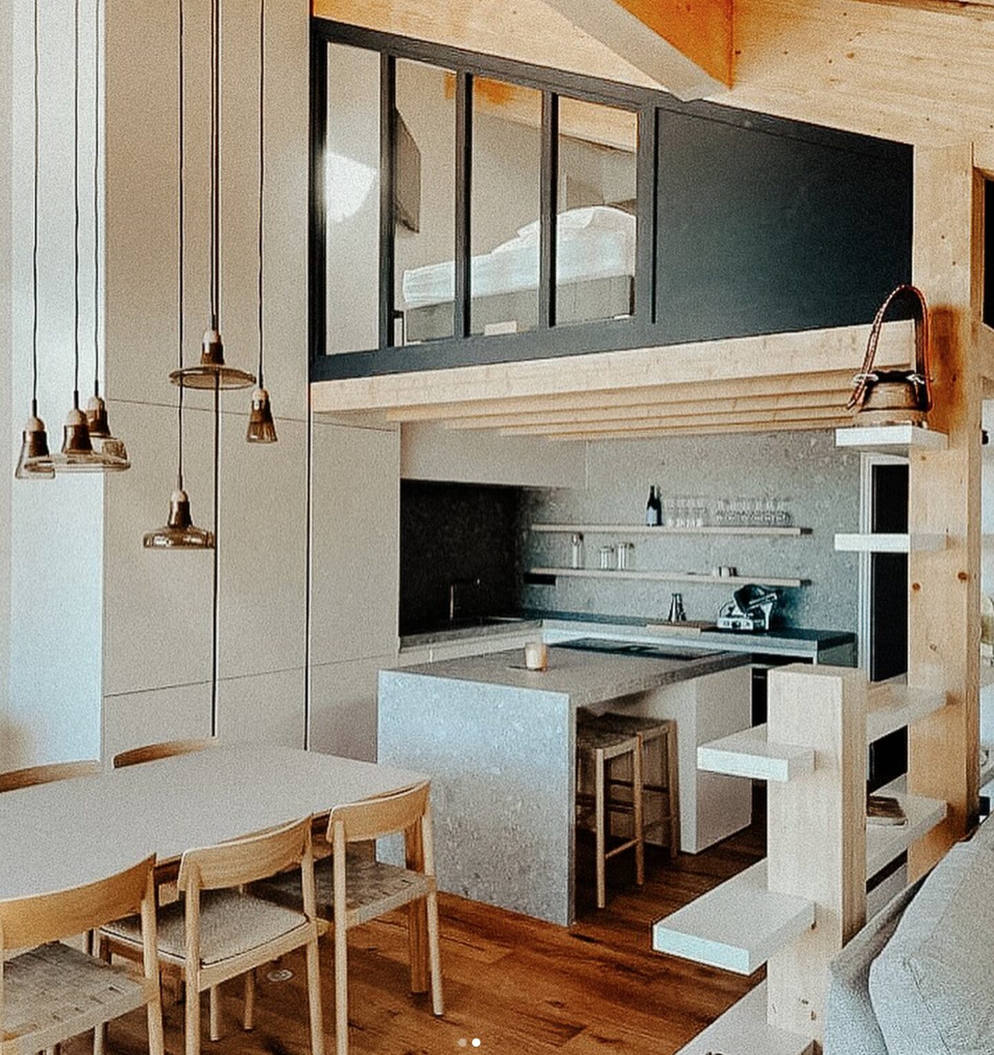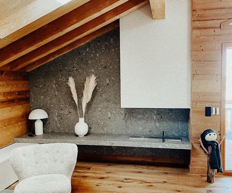 Dans ce chalet de montagne, Alpes Léman Marbrerie signe deux réalisations complémentaires : un habillage de cheminée contemporaine et une cuisine sur mesure, toutes deux conçues en céramique Ceppo Di Grey. Cette pierre reconstituée d’inspiration italienne, connue pour son aspect minéral brut et son jeu de galets incrustés, apporte une élégance naturelle et intemporelle à cet intérieur chaleureux dominé par le bois.