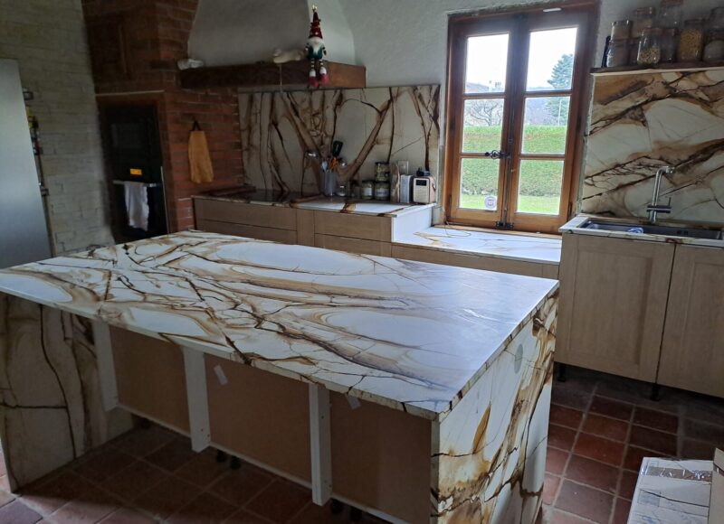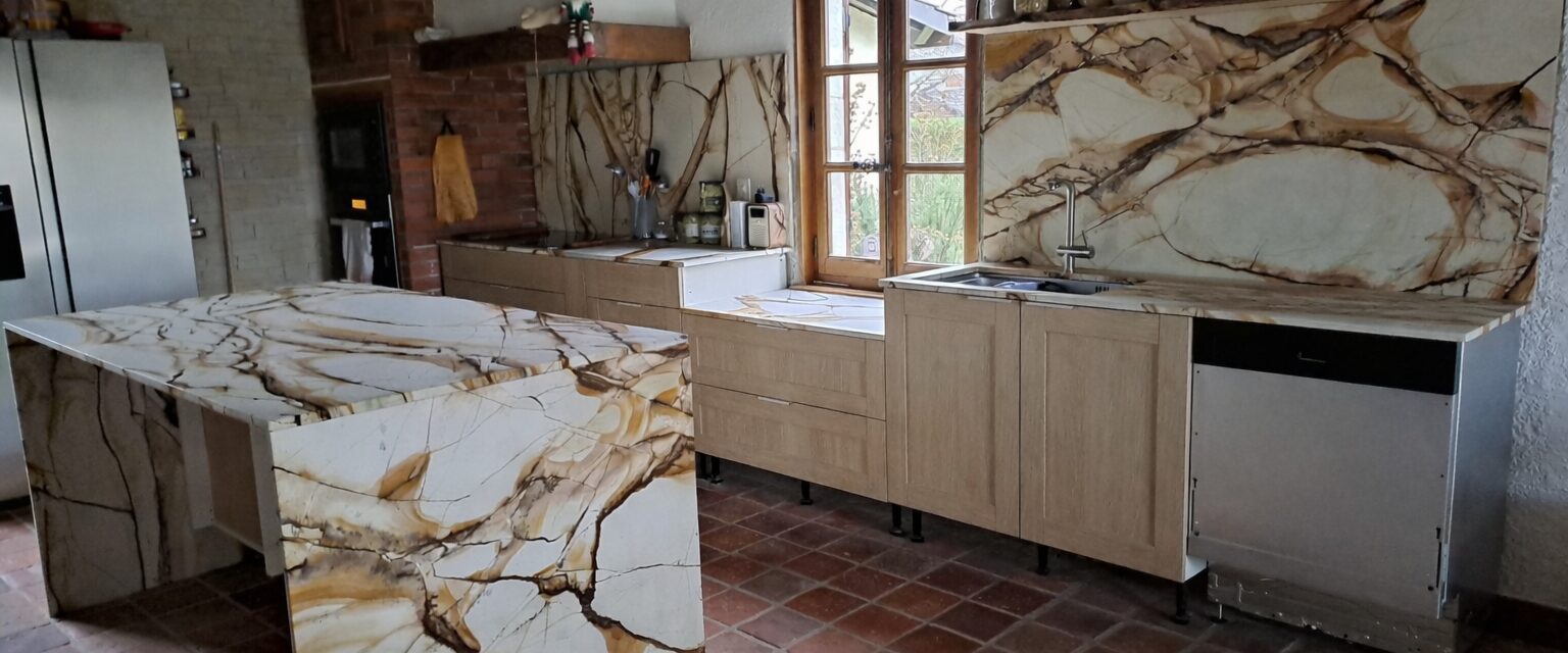 Cette réalisation met en avant notre savoir-faire dans le travail de la pierre naturelle pour les projets de cuisine en Suisse voisine, qu’il s’agisse d’un accompagnement complet ou d’une fabrication en emporté.