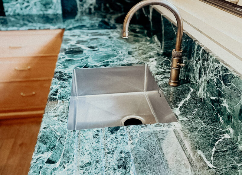 Extrait des carrières du Val d’Aoste, le marbre Verde Alpi séduit par ses nuances changeantes, oscillant du vert profond au vert clair selon la lumière. Son veinage blanc et argenté, tantôt fluide, tantôt contrasté, confère à chaque surface une personnalité unique. Utilisé ici pour le plan de travail, la crédence et l’îlot central, il s’associe parfaitement au bois clair, créant une atmosphère chaleureuse et raffinée, typique des chalets de montagne revisités dans un esprit contemporain.