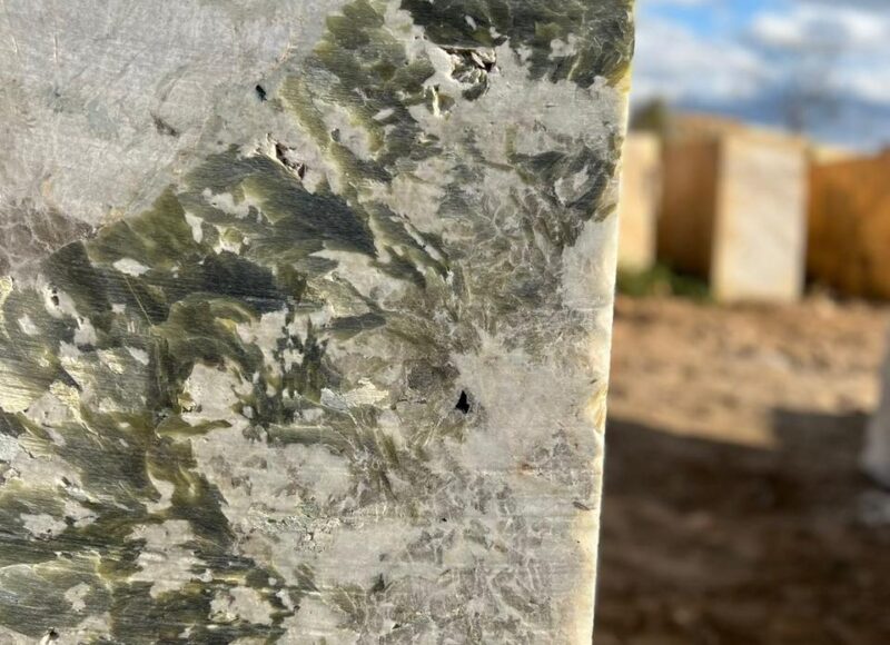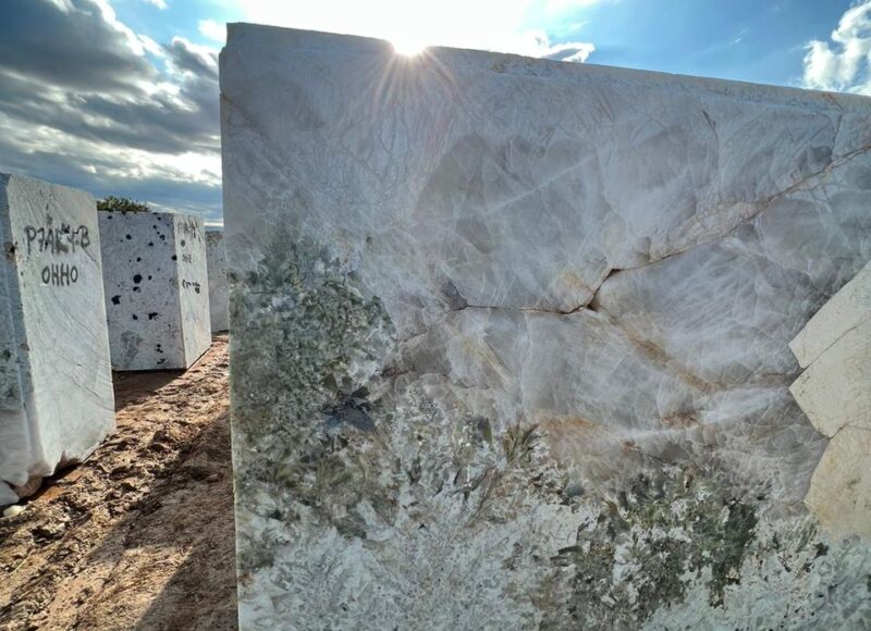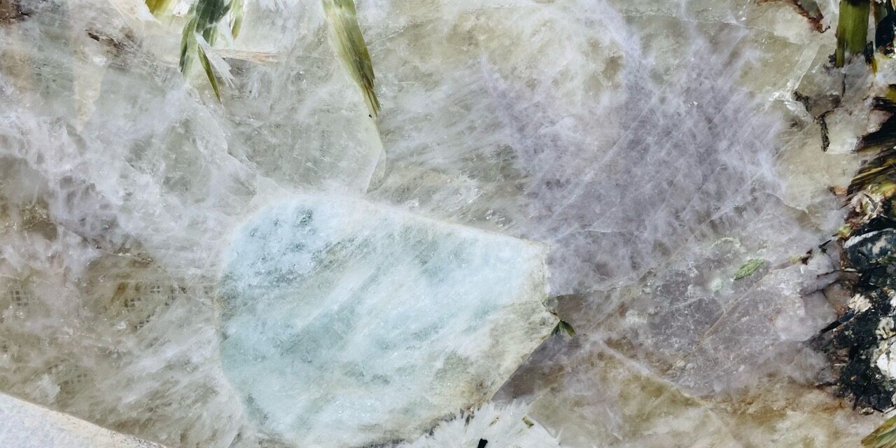 Le granit Blanc Austral se distingue par une composition minéralogique rare. Constitué majoritairement de feldspath (74 %), il est enrichi de quartz (20 %), de muscovite (5 %) et de biotite (1 %). Cette base est ponctuée de minéraux précieux, qui viennent sublimer son apparence. On y retrouve des tourmalines vertes aux reflets intenses, très recherchées par les collectionneurs, des tourmalines roses, appréciées pour leur teinte délicate, ainsi que des tourmalines noires. Ce granit contient également du béryl, minéral rare dont certaines variétés sont classées parmi les pierres précieuses, et de l’aigue-marine, joyau emblématique du Brésil qui y possède ses plus grands gisements. Ces inclusions rares transforment chaque dalle en une véritable œuvre minérale, spectaculaire et singulière, où la robustesse du granit se marie à l’éclat des pierres précieuses.