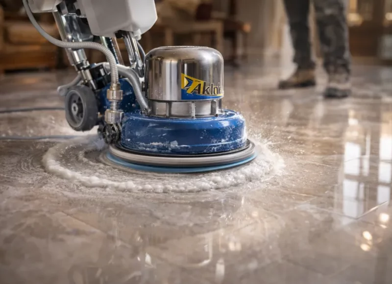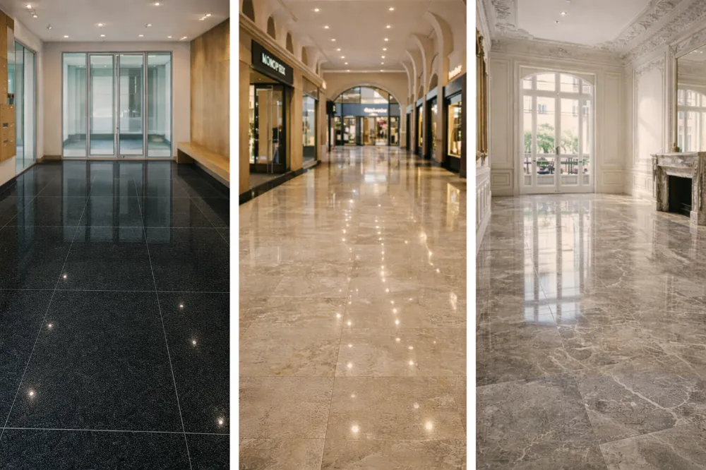 Le ponçage corrige l’usure et les défauts en travaillant la surface. Le polissage/lustrage affine le rendu. La cristallisation peut être envisagée selon les pierres et les objectifs de brillance.