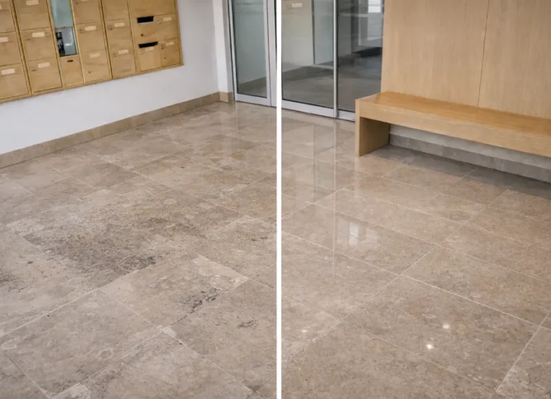 - Sols marbriers en hall d’entrée : zones ternies → rendu plus homogène