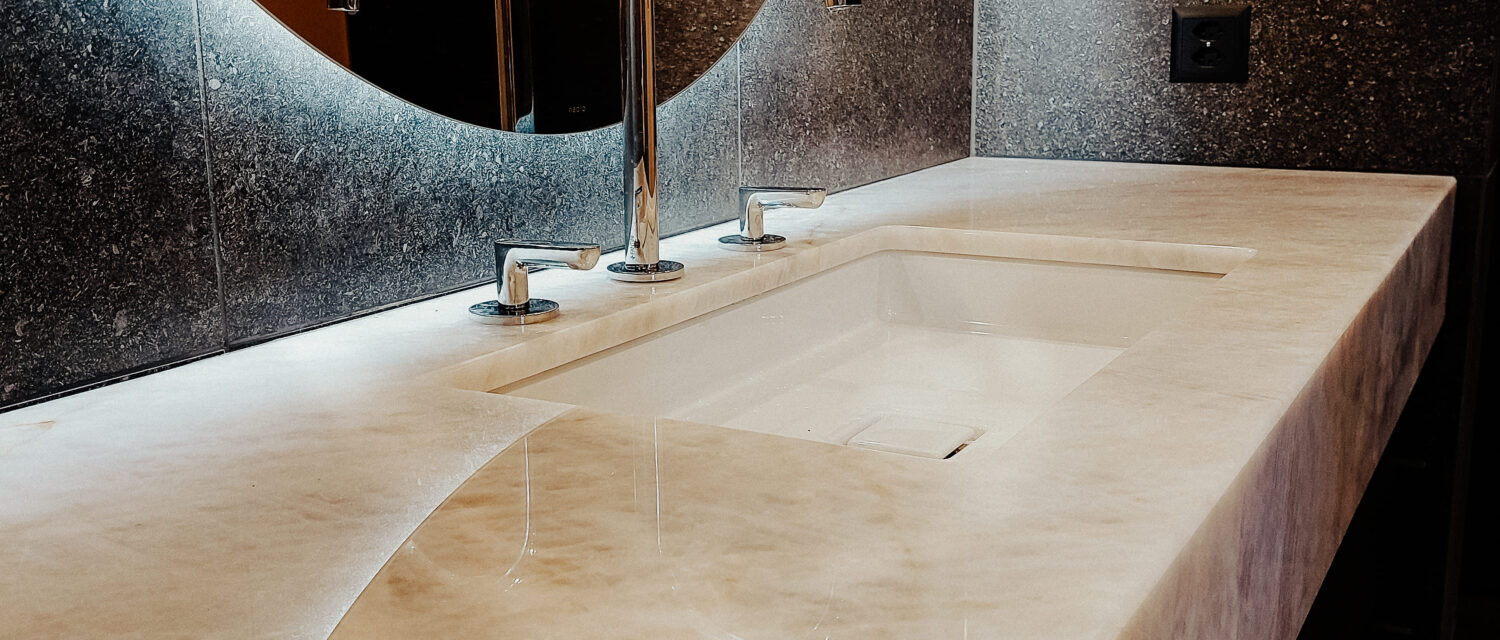 Chez Alpes Léman Marbrerie, nous façonnons des plans vasques mais aussi des receveurs de douche et des habillages de sols et de murs en pierre naturelle. Nos réalisations sur mesure allient esthétique, précision et émotion, dans toute la Haute-Savoie, le Pays de Gex et le bassin genevois. N’hésitez pas à nous contacter.